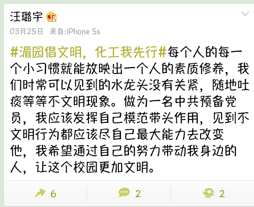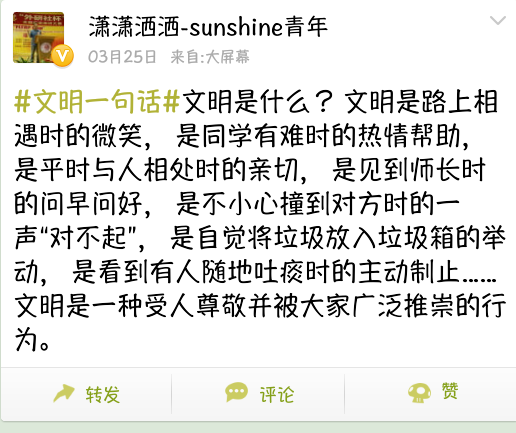 为了提高同学们的自身文明素质,从3月25日开始,我院举办了为期三天的“文明承诺一句话”校园新浪微博话题大讨论活动。