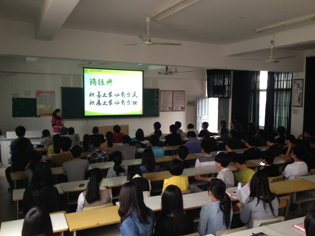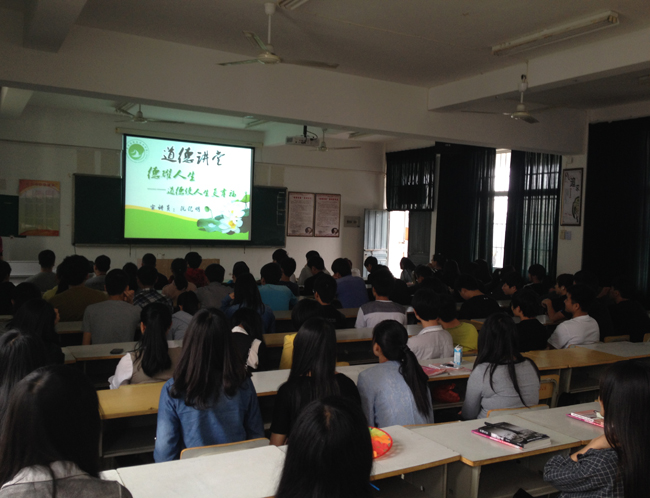 2014年4月15日下午,我院道德讲堂在31#402开课,本次道德讲堂主题为“厚德善行”。活动开始,主持人通过“静默省心”、“听唱孙楠歌曲《把幸福给你》”两个环节引导学生反省内心。接着主持人播放视频短片《全国道德模范郭明义爱的故事》,学习郭明义以德树人的高尚行为,感染身边更多的人加入到积德行善的行列中。活动第四个环节院党总支书记阮亿明为同学们做“德耀人生——道德使人生更幸福”专题讲座。一开场阮老师就抛出两个问题,道德究竟是什么?人类为什么需要道德?接着,阮老师引用身边的事例深入浅出地进行了回答。然后阮老师与同学们一起就中国传统道德的主要内容,关于如何对待“利”与“义”、如何对待人际关系、如何提高个人修养等内容进行了深入的探讨,最后提出他个人的观点:将高尚的追求与平凡的实践相结合——“道德使人生更幸福”。整个讲座持续两个多小时,会场气氛活跃。学生们纷纷表示,参加本次道德讲堂获得很多教育和启示,今后一定会从身边小事做起,争做有德青年。
