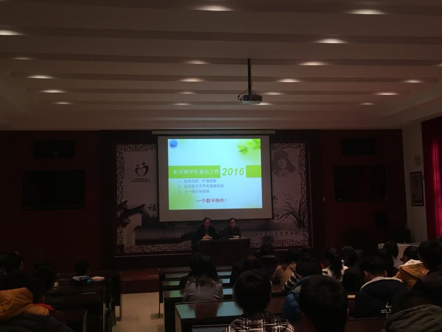 会上首先由翁秀琴老师布置本学期工作重点,她强调本学期将继续严格考勤制度、课堂无手机制度,加强宿舍管理、落实班会课、推行导师制等9大项工作。接着陈志君书记发表讲话,一是强调期初的心理调适问题,经过一个快乐的寒假,希望同学们尽快调整状态,适应校园生活;二是强调期初安全,希望同学们特别是女生要提高安全意识,防患未然;三是解读我院学生培养目标,在学校学为成人的校训下,提出“三知三守”:知法守纪,知礼守信,知义守正,助学生成长成才;最后陈书记说到,2016年10月学校将迎来教学二轮评估,本学期重点将开展学生学习成效展示演练,大一大二学生全员参与,一个都不例外,以学生学习成效展示为契机,增强我院学生综合素质培养。
