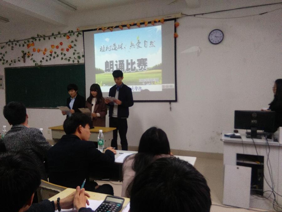 本次比赛以“植树造林,热爱自然”为主题,大赛吸引了四五十名同学参加。伴着悠扬的音乐,第一组选手以《致大自然》拉开了大赛的序幕。选手们或慷慨激昂,或低沉凝重,他们将内心深处的情感通过朗诵的形式表现出来,希望用他们最真挚的情感打动评委以及在场观众的心。在他们的感染下,现场气氛变得热烈起来。在朗诵接近尾声的时候,党总支书记对此次朗诵比赛进行了点评。一是希望同学们认真准备,沉着应战;二是希望在比赛中听到更多饱含真情的朗诵。