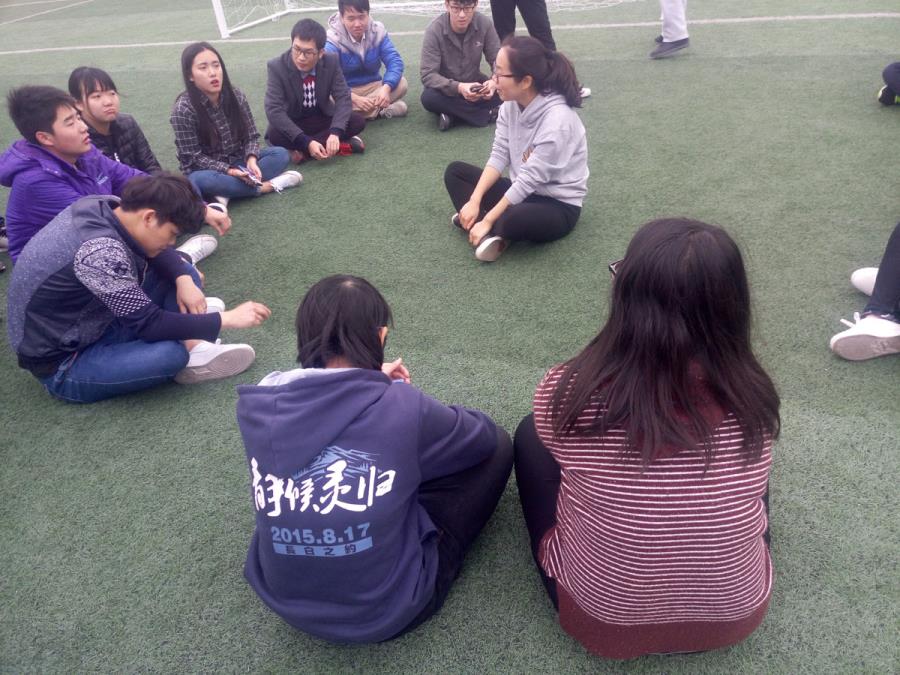 3月21日下午,四百米操场上,一群同学围站成一圈,每人手中牵一根引绳,中间拉着一个鼓,一个排球落在鼓上又被弹起,1,2,3……这是海洋与环境学院开展与辅导员在一起锻炼活动的现场。