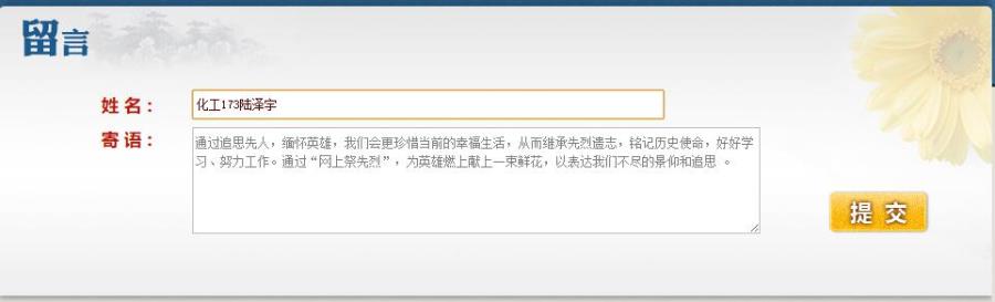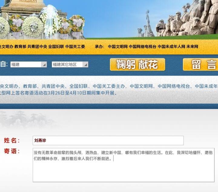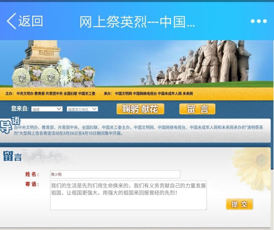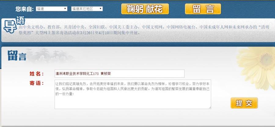 清明前后,我系组织学生开展了“网上祭英烈”活动。活动有效地将网络教育和革命传统教育结合在一起,通过网络浏览革命先烈的英雄事迹,让学生了解了先烈们的抛头颅洒热血的英雄事迹,同时通过网络上鞠躬献花、抒写感言寄语的方式缅怀先烈。