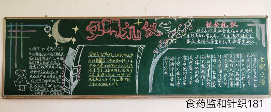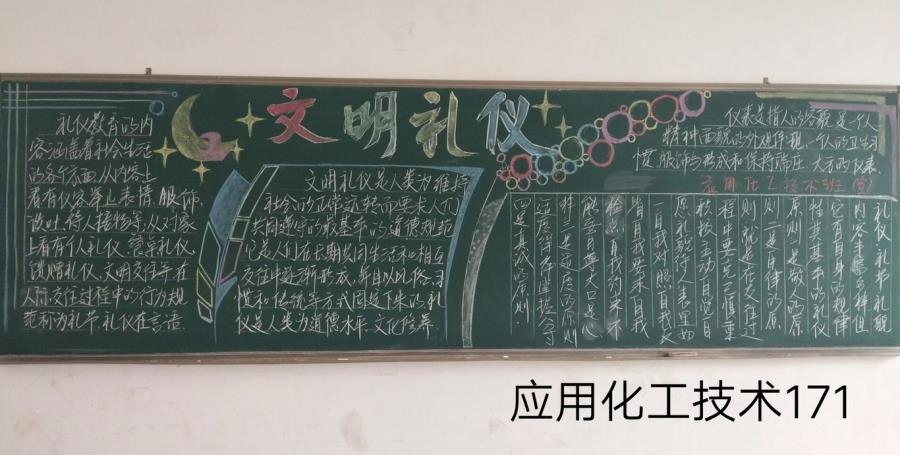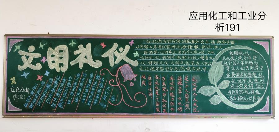 本次黑板报围绕“大学生校园文明礼仪”为主题,我系12个班级在班干部的带领下积极准备、认真设计,按时完成黑板报。大部分班级所展示的板报内容紧贴主题、创意新颖、版面布局合理。通过系部老师以及同学们的参评,最终选出了前三名。他们是食药监和针织181班、应用化工和工业分析191班和应用化工技术172班。