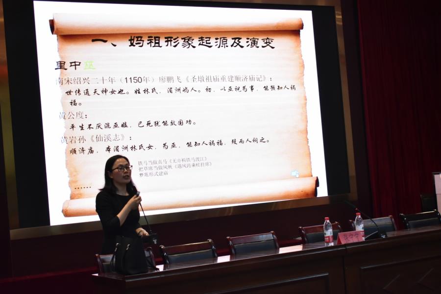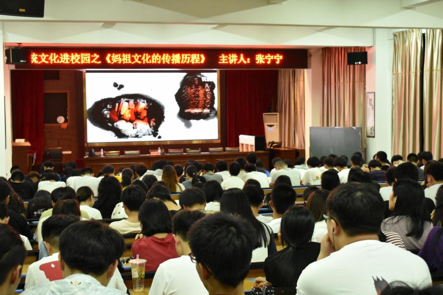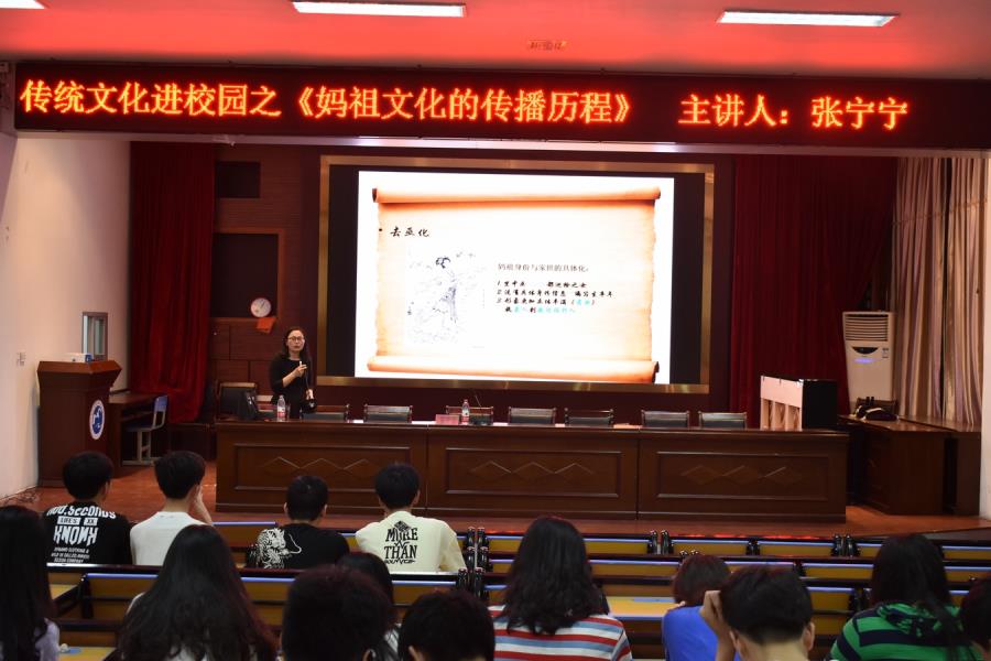 农历三月二十三日是妈祖诞辰的日子,为了提高我系对传统文化的认知与了解,进一步弘扬妈祖“立德 行善 大爱”的精神,4月25日晚上,我系在一层报告厅举行《妈祖信仰的起源及其传播》专题讲座。讲座特邀莆田学院文化与传播学院张宁宁副教授主讲,讲座由我系党总支负责人翁秀琴主持,17、18级部分学生代表参加了此次讲座。