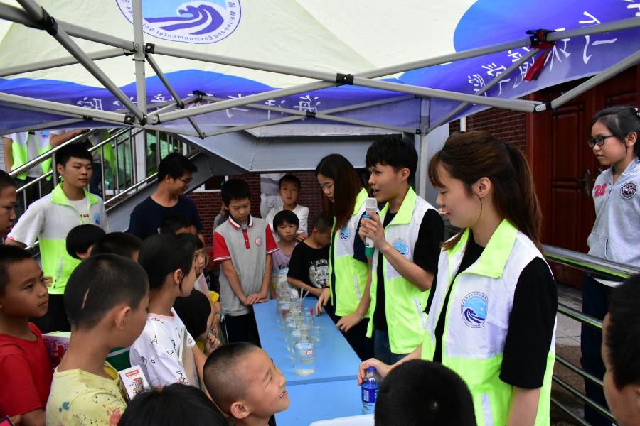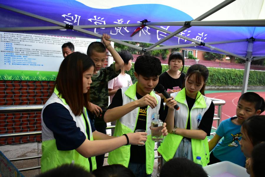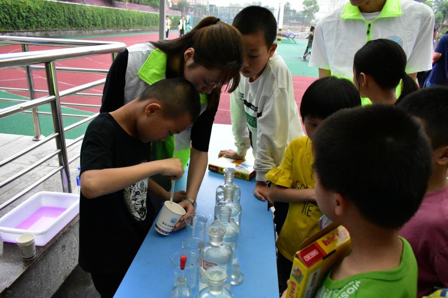 在演出的同时,志愿者们还利用所学的专业,为孩子们做起了有趣的化学小实验,每个孩子带着好奇心认真地观察实验,看着溶液由无色变成红色、紫色、蓝色等,觉得好神奇!志愿者衷心地祝愿小朋友们像这有趣的变色实验一样,拥有五彩斑斓的童年。