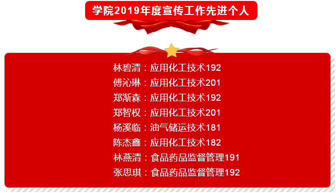 学院2019年度宣传工作先进个人:应用化工技术192林碧清,应用化工技术201傅沁琳,应用化工技术201邓智权,油气储运技术181杨溪临,应用化工技术182陈杰鑫,食品药品监督管理191林燕清,食品药品监督管理192张思琪。