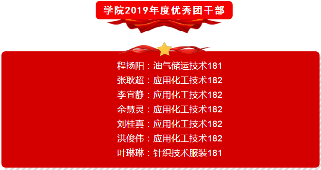 学院2019年度优秀团干部:油气储运技术181程杨阳,应用化工技术182张耿超,应用化工技术182李宜静,应用化工技术182余慧灵,应用化工技术182刘桂真,应用化工技术182洪俊伟,针织技术服装181叶琳琳。