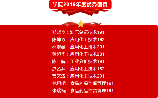 学院2019年度优秀团员:油气储运技术191郑晓李,应用化工技术192陈坤致,应用化工技术201林娜薇,应用化工技术201黄超华,工业分析技术191陈一航,应用化工技术182洪乙波,应用化工技术182曹文涛,食品药品监督管理191林思明,食品药品监督管理191张瑞楠。