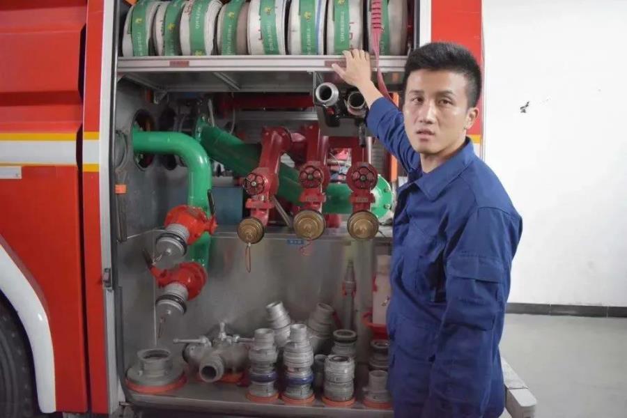 首先,在讲解员的带领下,志愿者们首先来到了车辆装备库,救援服、防火服、头盔、手套、工具腰带等装备整齐划一的摆放在地上,讲解员一件一件耐心的介绍给大家。随后,装备架的旁边就是大家最感兴趣的消防车了,讲解员分别为我们介绍了中卓车,泡沫车的装备器材,并介绍了不同情况,使用不同装备,向志愿者们近距离展示了消防车辆的内部结构和存放的消防器材。最后,在讲解员的带领下,让同学们体验了战斗服,水带的重量,并乘坐云梯车。
