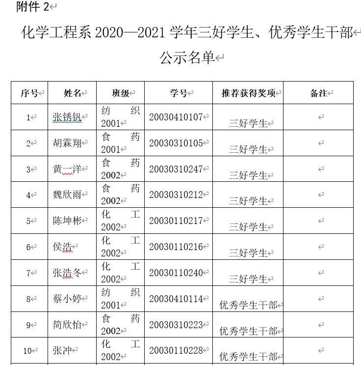 2. 化学工程系2020—2021学年三好学生、优秀学生干部公示名单