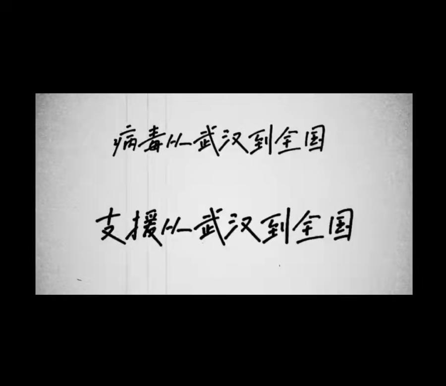 “病毒从武汉到全国,支援从武汉到全国““你要记住爱和希望比病毒蔓延得更快“”我不知道你是谁,但知道你为了谁”“总有人在我们看不见的角落,默默坚守,撑起万家团圆,灯火通明”在视频中短短几句话简述了从疫情开始到现在,从不知所措到所有人都众志成城的为疫情防控努力着。