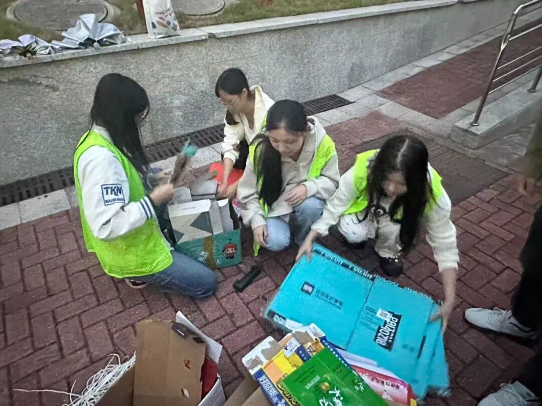 活动结束后,志愿者们并未立即离场,而是对现场垃圾进行了二次分拣与整理。面对体积较大的纸皮制品,大家分工协作,逐一拆解、压平,并进一步区分为有色纸皮与无色纸皮,分别投放至对应回收筐,力求实现垃圾精准分类与资源高效回收。