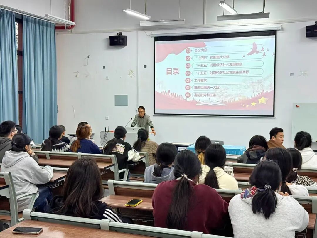 党课第一部分,杨海贤副主任系统阐释了党的二十届四中全会精神。他围绕全会《建议》的三大板块结构,详细介绍了“十四五”期间我国在经济建设、科技创新、民生改善等十二个方面取得的重大成就,深入解读了“十五五”时期“六个坚持”的发展原则以及七大经济社会发展主要目标,重点讲解了产业发展、科技创新、绿色发展等关键领域的战略部署,并结合化工专业特点,分析了新能源、新材料等产业带来的发展机遇。