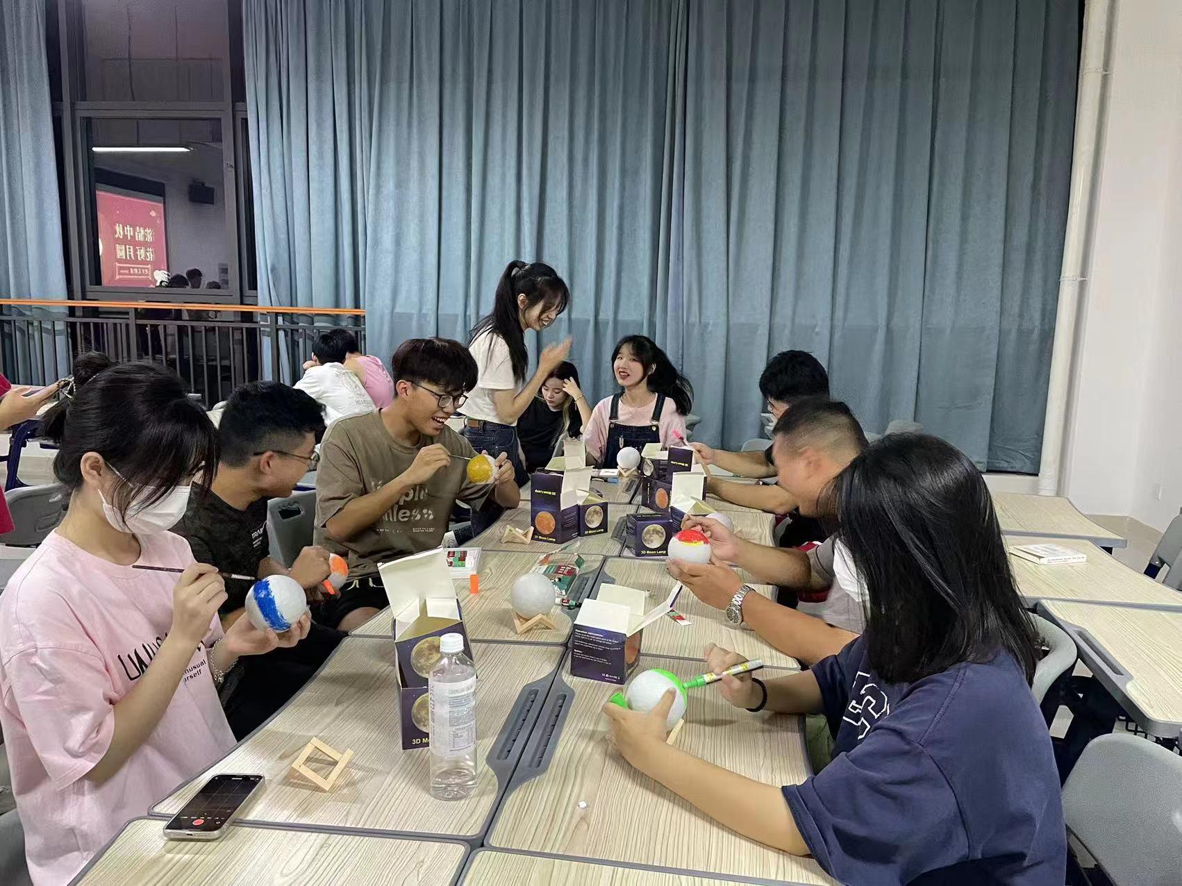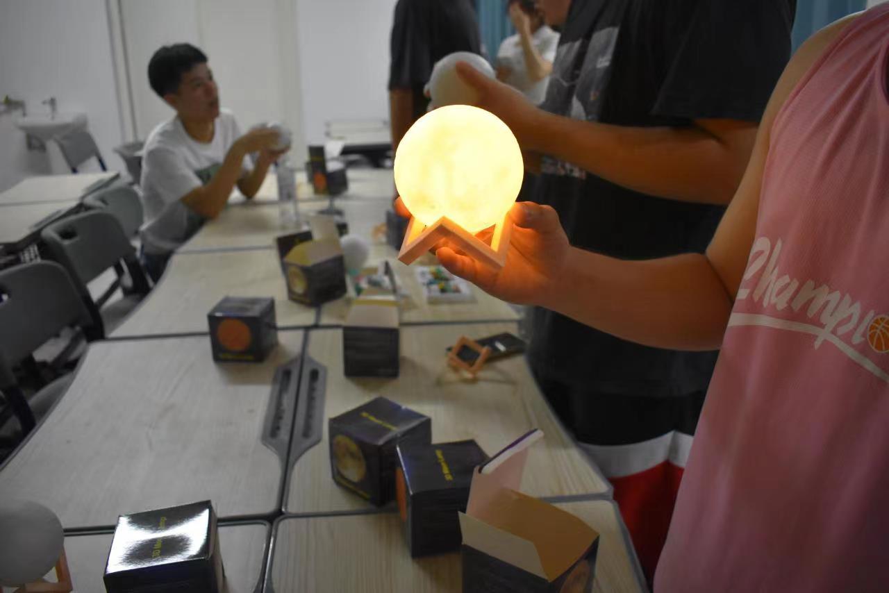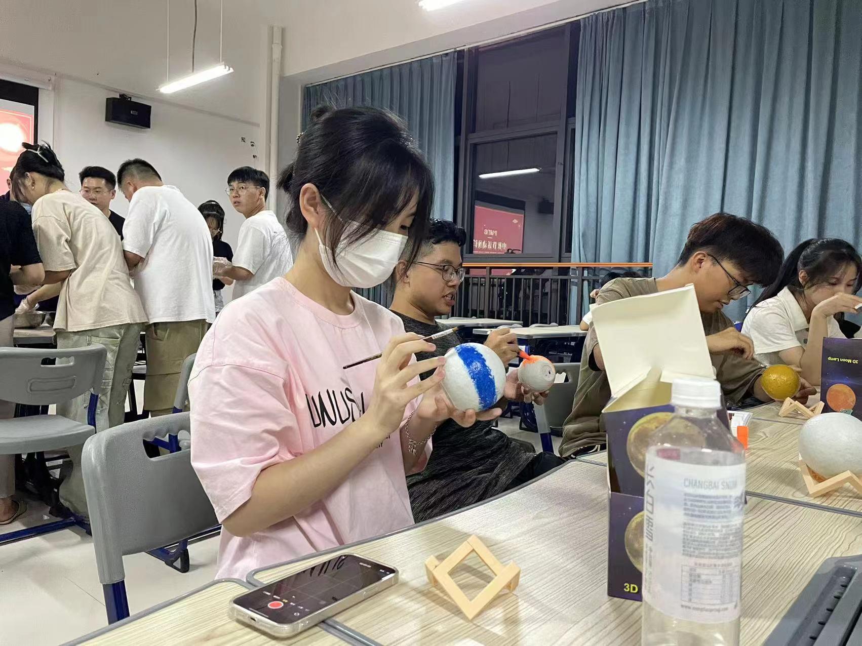 另一边,同学们正在认真的DIY星球灯,只见他们手持画笔,发挥各自的无限想象,将探索宇宙月球的好奇心尽数挥洒,奇幻的色彩搭配浪漫的柔光,一颗颗美丽的星球逐渐呈现出来,一个个炫酷而又极具创意的斑斓星球开始慢慢成形,一盏盏个性化的星球在同学们的的巧手下陆续完成了。随后大家迫不及待给作品通上电源,星球散发着柔和的“月光”,更烘托了节日的氛围。