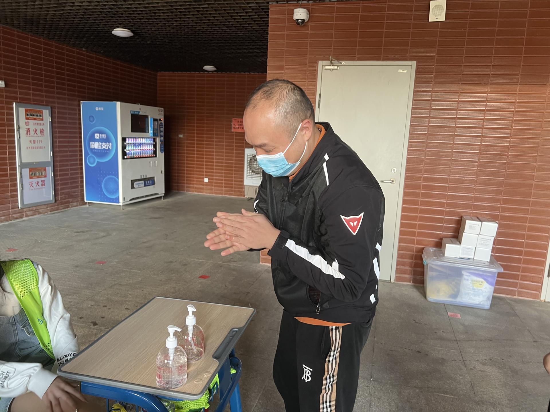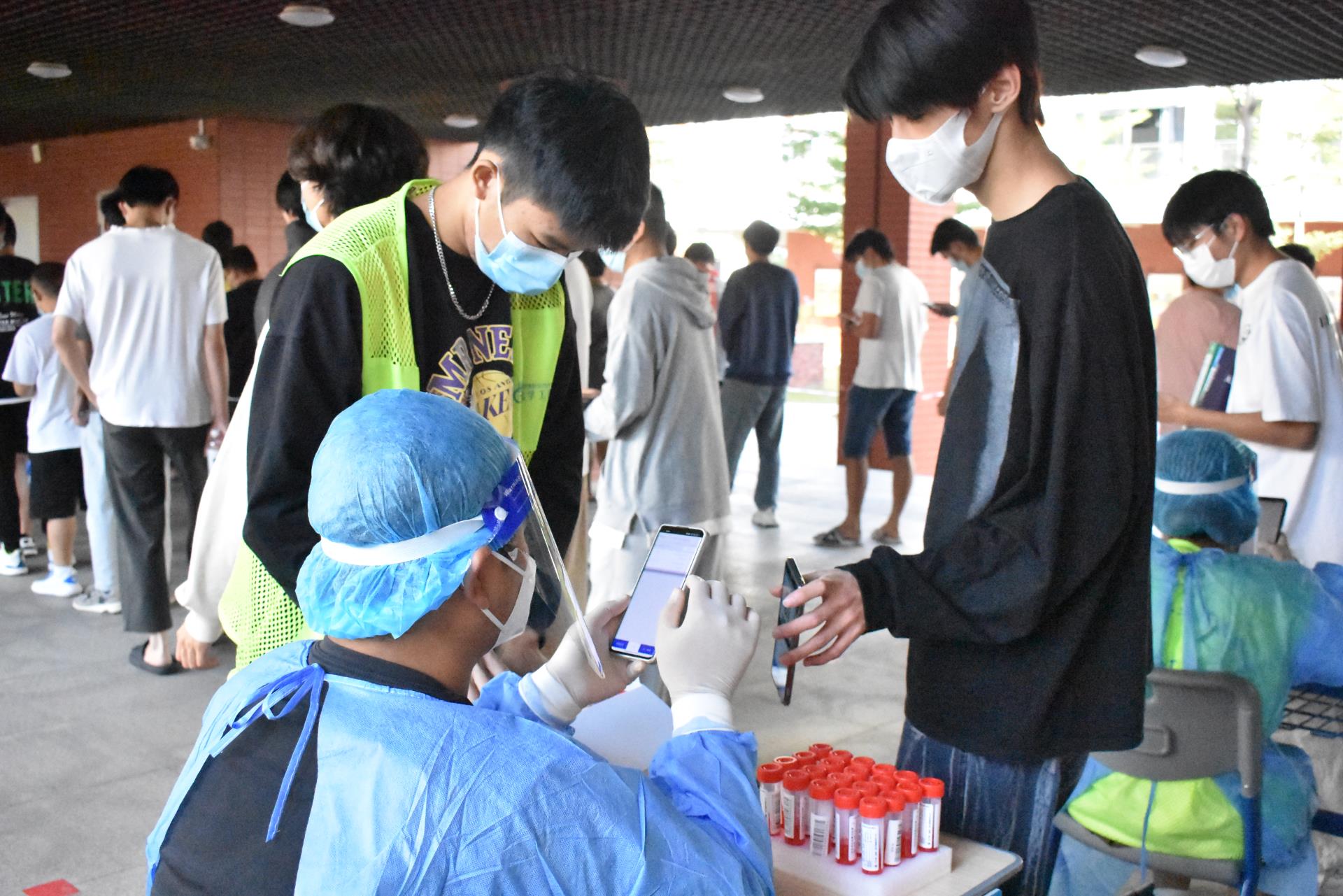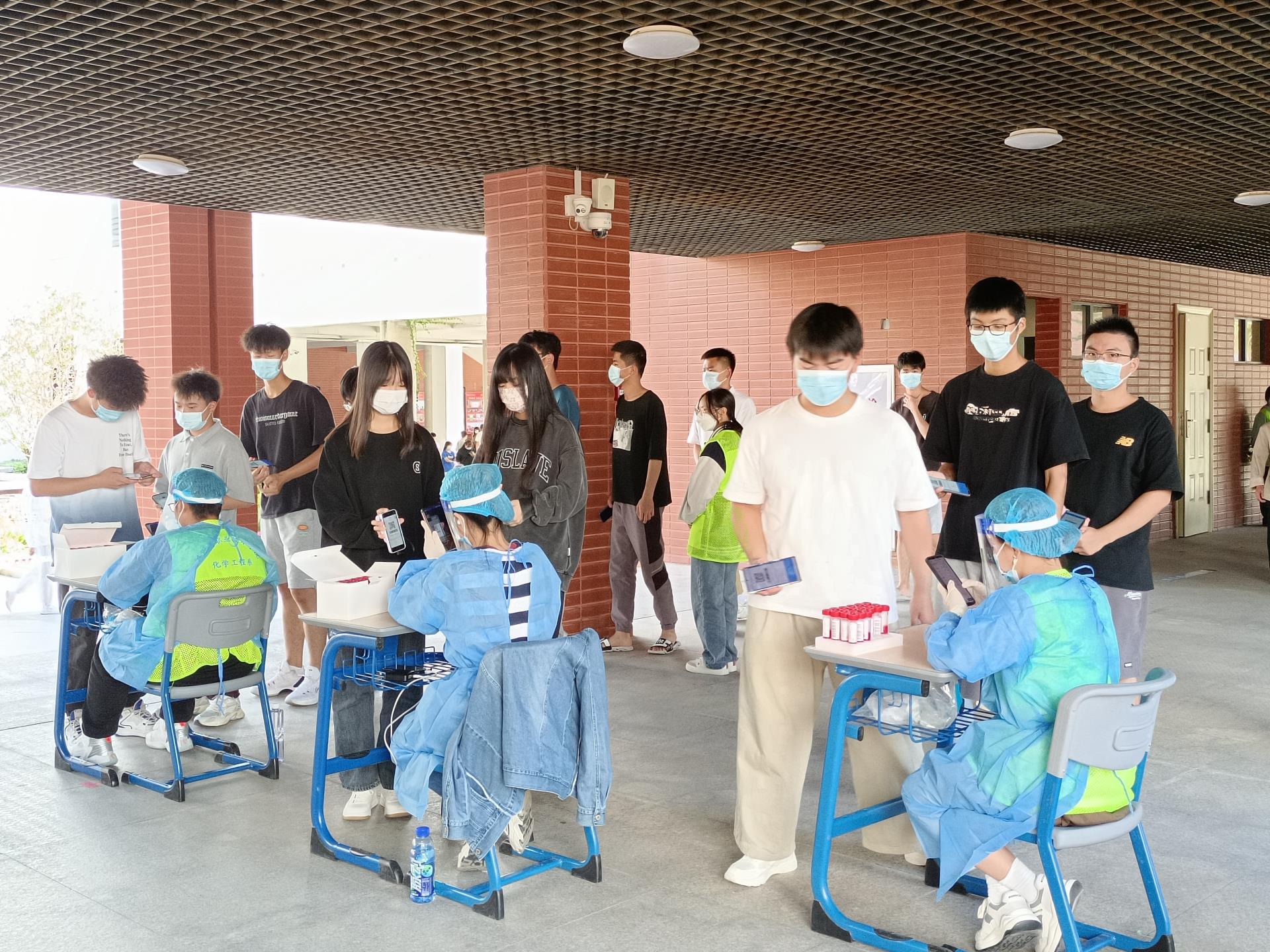 在现场,党员教师和志愿者们不断提醒核酸检测的同学们“保持一米线距离”,“戴好口罩,准备采样码码”,“接种完新冠疫苗48小时内不能做核酸”“请大家有序排队,注意1米线间隔,站在线上!”“做完核酸记得洗手,不要逗留”。党员教师和学生志愿者们穿梭在核酸队伍中,有条不紊地协助核酸检测工作,他们认真的志愿服务态度,充分体现了化学工程系的风采与担当。核酸检测的过程中,医护人员们迅速拆开包装,取出棉签,进行核酸采集,一系列动作一气呵成,以最大速度完成工作。医护人员和志愿者们各司其职,同心,同力,确保核酸“加速度”,守护着全校师生们的在校安全。