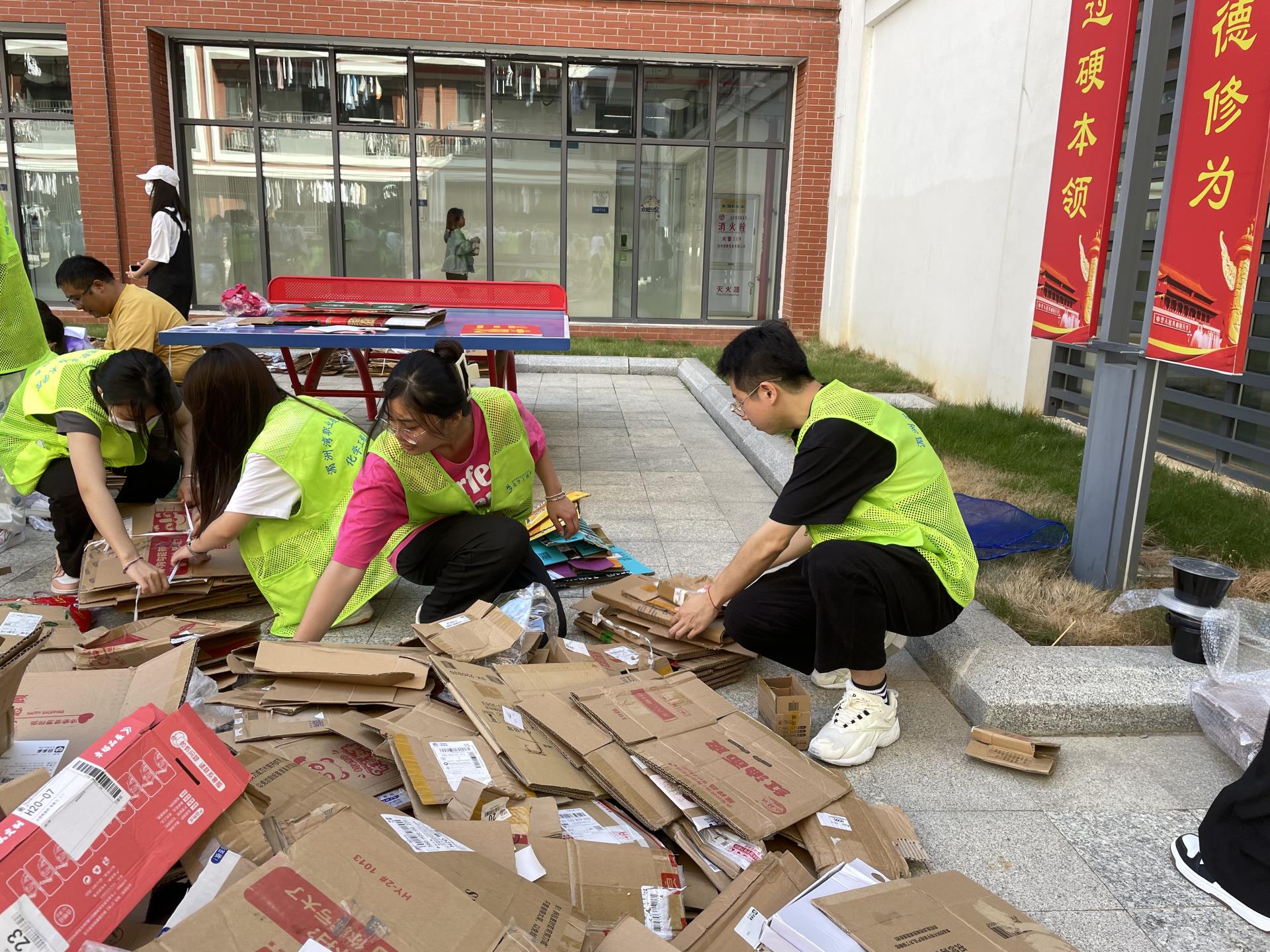 我系辅导员翁东旭和志愿者们一起身穿荧光绿服一起加入到垃圾分类的行动中,同学们首先认真听取翁东旭辅导员就本次志愿者服务内容、要求、安全、等事项的讲解。紧接着在翁东旭辅导员带领下,来到兰苑宿舍区开展垃圾分类实践活动。太阳很大,但哪怕汗流浃背志愿者也依然分工有序地进行称重记录与分类。将纸箱、瓶子进行不同分类。期间翁东旭导员也投入到垃圾分类中,帮助志愿者们进行纸箱分类,将地上的垃圾清扫干净,用行动告诉同学们,促使同学们积极参与到实践中来,营造更好的校园环境。我系导员翁东旭和志愿者们用自身行动做绿色理念的宣传者,将垃圾分类的意义、种类等内容,细化到如何区分各类垃圾、深入到具体生活中,为美丽湄园贡献出自己的一份力量。