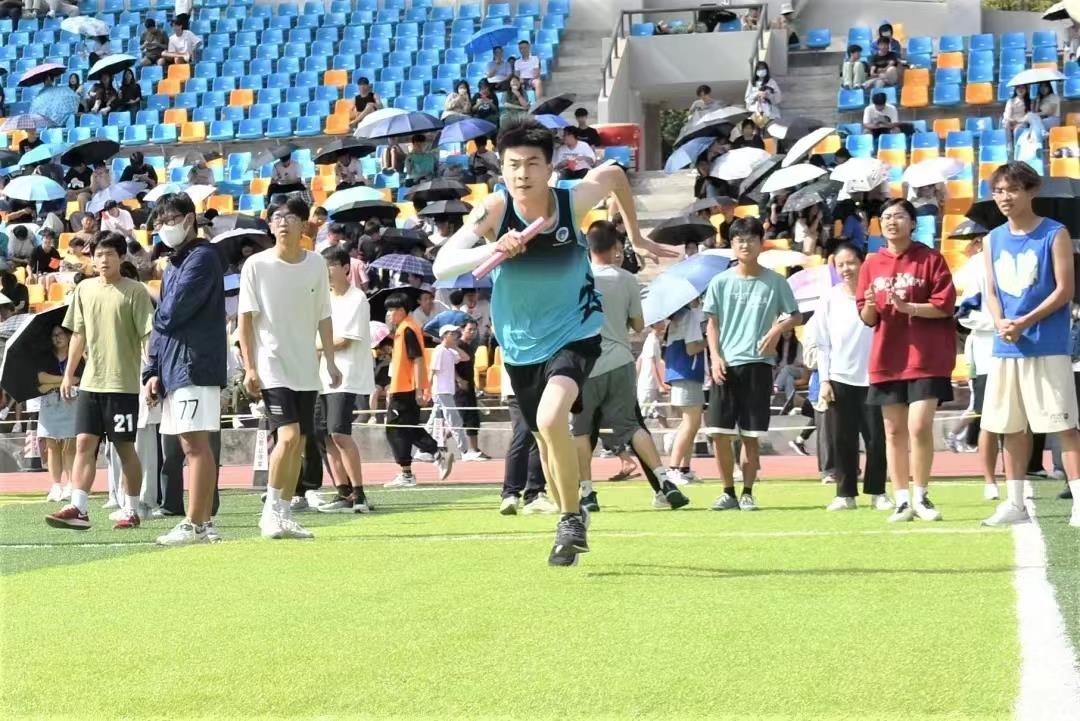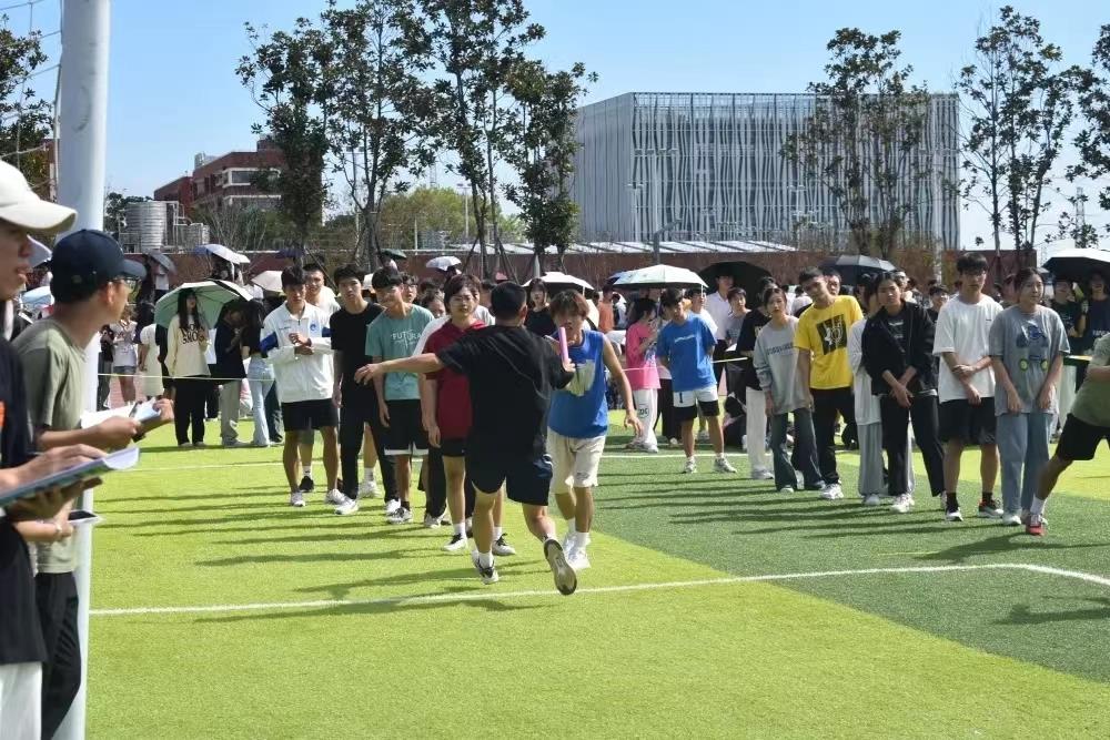 比赛在草坪上开启,男女各10人在场地两端站立开始,听到信号后持棒快速奔跑至同伴完成接棒后继续进行到结束。第一名接力员紧紧握住接力棒,脚瞪着弓步,身子向前微微倾斜,眼睛盯着前方,像一只随时准备出发的箭。“砰”的一声,倏地冲出了草坪起跑线。接力棒传了一棒又一棒,加油的呼喊声此起彼伏。草坪安全线圈外的观众都为这紧张的场面激动欢呼,同时接棒的运动员奋力冲刺拉短差距却毫不松懈,争取不摔倒不掉棒,稳定发挥。等待的队友无不在紧张担忧,蓄势待发。不长不短的距离,需要的是人与人的协作默契及爆发力,自始至终他们都在拼全力此时此刻,他们处在最风光的一刻,无论第几也一样坚持团结奋进的信心!