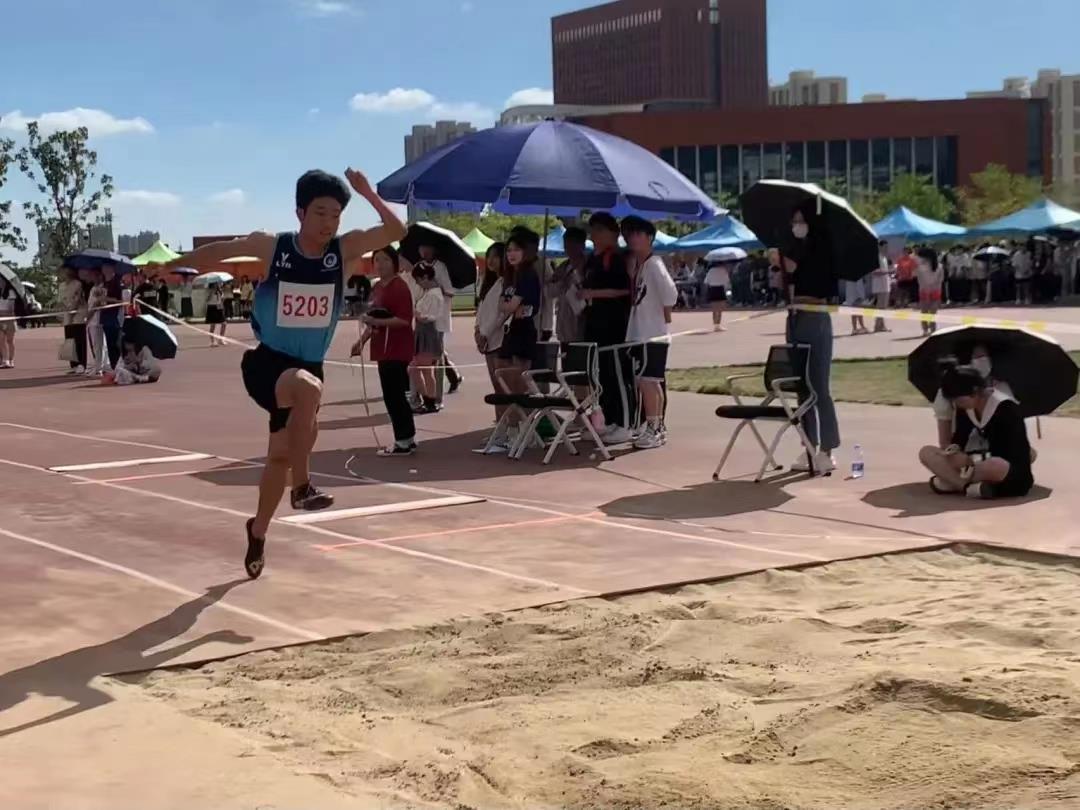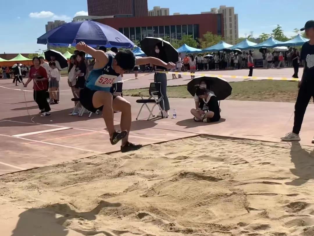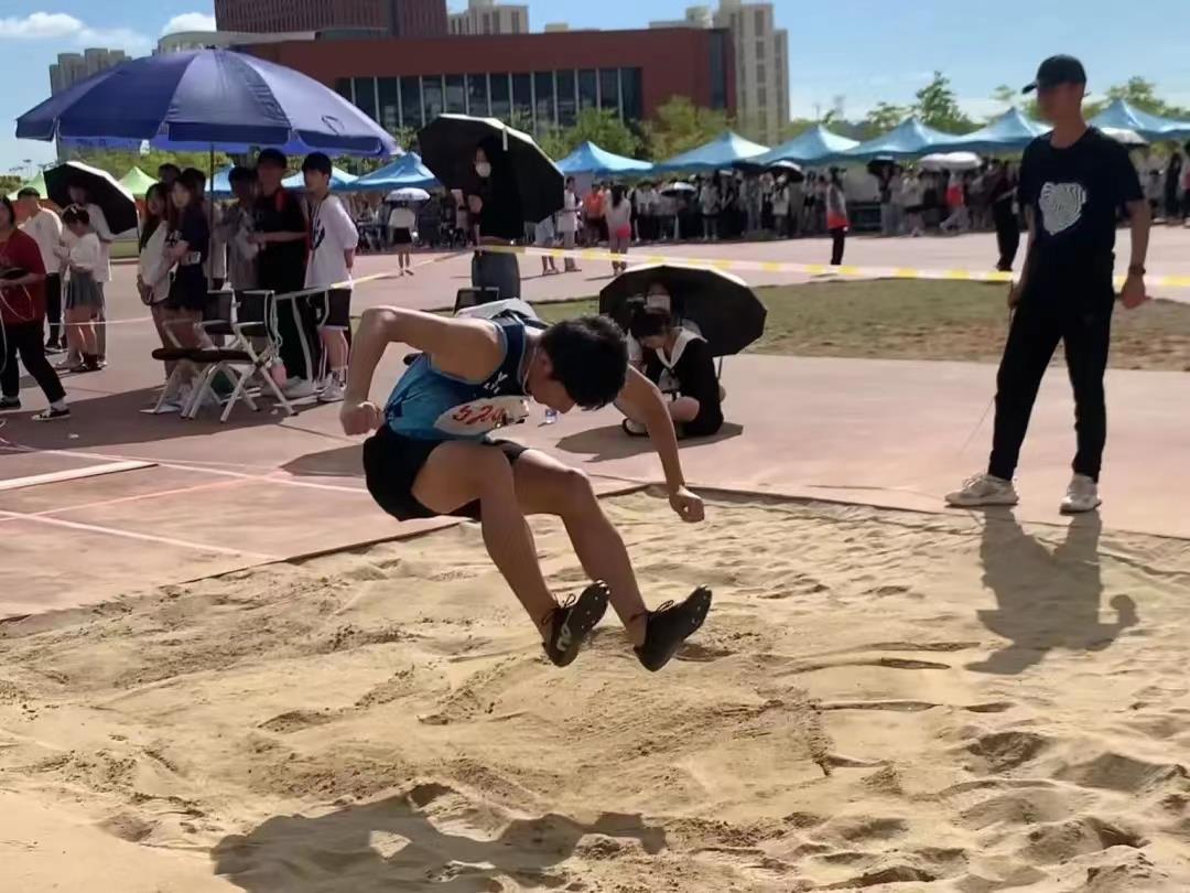 比赛前,我系运动员抓紧每一次试跳机会,竭尽所能让自己在赛前迅速进入状态,以最好的状态来参与此次比赛。随着裁判员的呼喊,三级跳远比赛就此开始。我系运动员迅速从起点加速前进,每向前迈开一步,都是在为起跳蓄力。一小段冲刺后,他们身体前倾,手尽量向上摆至最高,第一跳落地后脚部滚动,由脚跟到脚掌然后身体积极下压;第二跨步跳时上肢协调用力摆动,腿向前跨出积极落地;最后一跳摆动腿迅速向上抬伸,重心往前,其次收腹落地,一系列动作一气呵成。每一次起跳,运动员们都将动作做到极致,争取获得更好的成绩。观众席上,我系学子都在为运动员的每次突破呐喊助威。助跑、起跳、腾空、落地,一鼓作气。最终我系王宇取得了三级跳远的第一名。