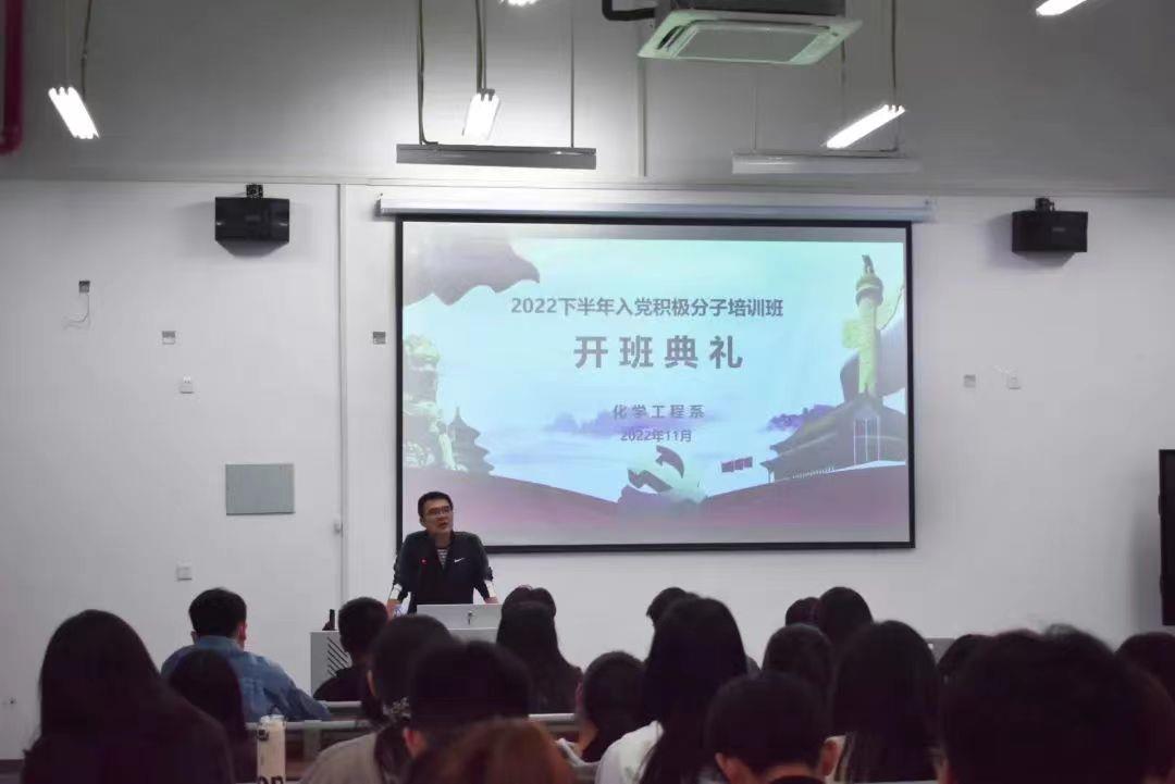 为全面学习贯彻党的二十大精神,高举中国特色社会主义伟大旗帜,全面贯彻新时代中国特色社会主义思想,弘扬伟大建党精神,学习习近平新时代中国特色社会主义思想,提升学生骨干、团干部、青年知识分子的政治素养和理论学习能力,培养一股自信自强、守正创新的的新时代红色先锋力量,2022年11月24日晚7点,我系于化工楼101教室开展了2022年度入党积极分子培训班开班典礼,本次活动由我系党总支副书记黄林毅主持!参与本次培训活动的是我系50余名学子。